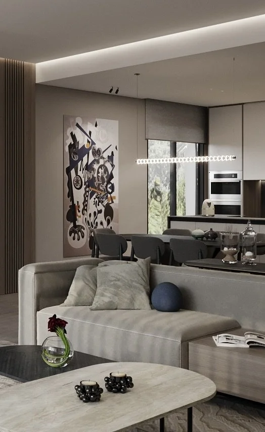A 250 sqm Scandinavian-inspired residence nestled in the vibrant coastal district of Kaslik, this apartment channels calm through its soft color palette and refined material mix. Glass, wood, and sculpted shelving converge in an open-plan layout, enhanced by a harmonious ceiling design and custom lighting that elevate the quiet sophistication of the space.